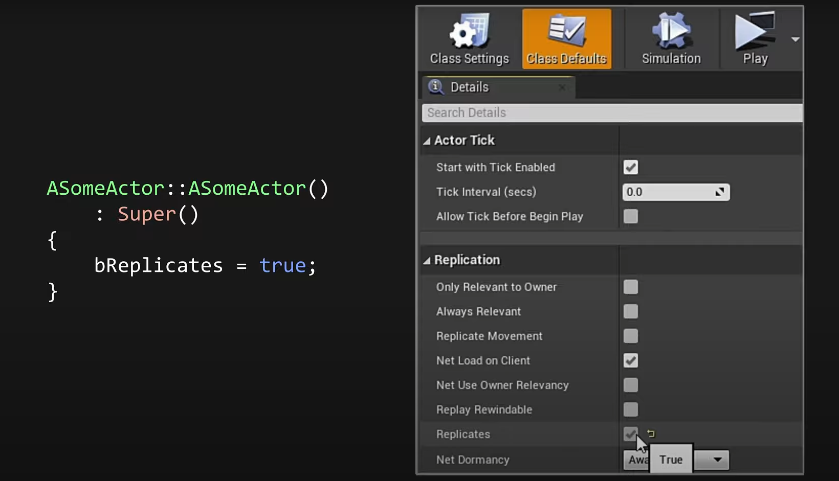 * **bReplicates Bayrağı**: Bir aktörün replikasyon yapılabilmesi için **bReplicates** bayrağının **true** olarak ayarlanması gerekir. Bu, aktörün ağ üzerinde replikasyona uygun olduğunu belirtir. Genellikle bu bayrak, aktörün yapıcı fonksiyonunda (constructor) belirlenir. Eğer aktör bir **Blueprint** ise, aktörün **ClassDefaults** bölümünde **"Replicates"** kutusunu işaretleyerek bu bayrağı etkinleştirebilirsiniz.